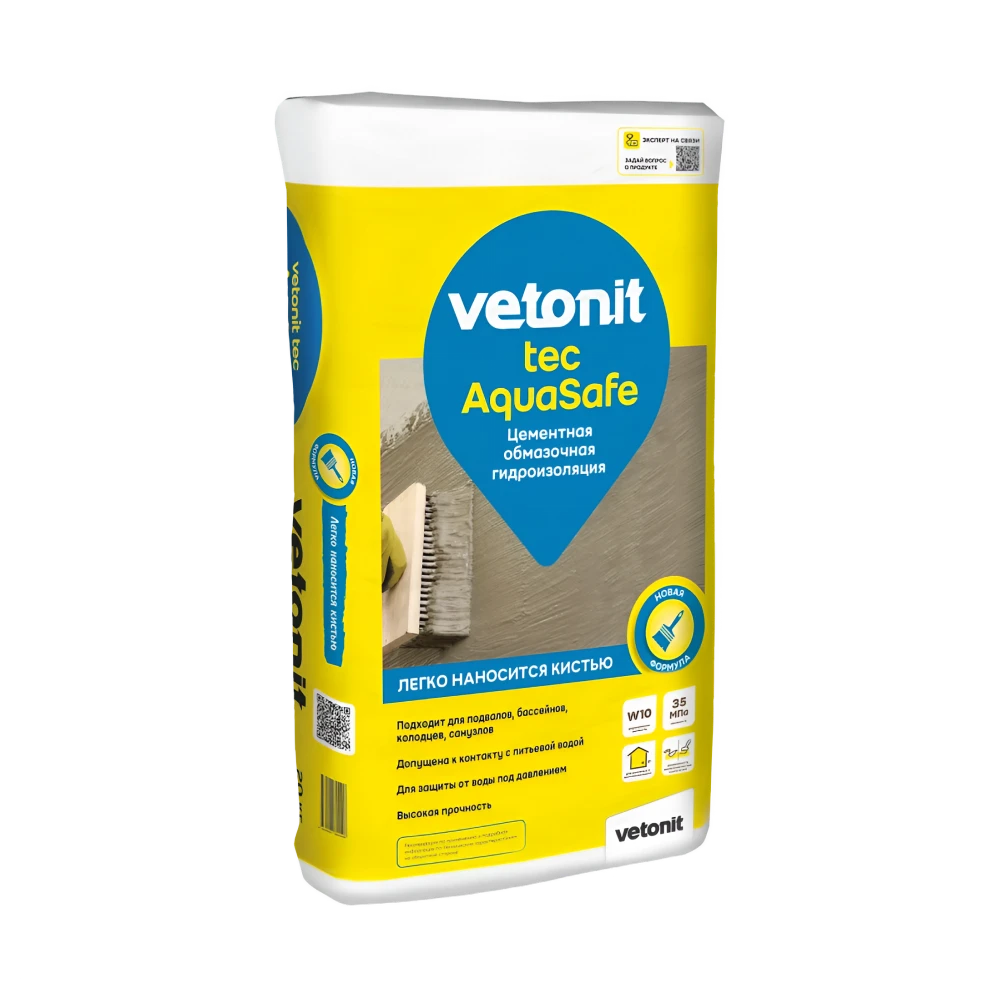 Vetonit Tek AquaSafe — цементная жесткая обмазочная гидроизоляция для надежной защиты строительных конструкций от воздействия воды, включая давление. Применяется для гидроизоляции фундаментов, стен подвалов, террас, балконов, ступеней, бассейнов, резервуаров (в том числе с питьевой водой), а также стен и полов в мокрых и влажных помещениях — ванных комнатах, кухнях, санузлах, прачечных и других. Используется внутри и снаружи зданий под последующую облицовку плиткой. Не предназначена для работы в условиях деформаций.