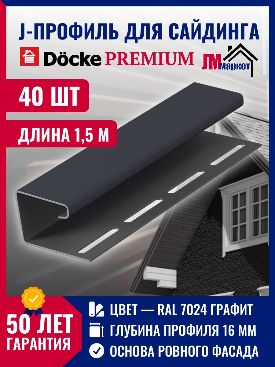 Купить J профиль Docke 40 шт х 1,5 м, цвет Графит для закрытия торцов панелей сайдинга и софитов кровли для серии Standart и Premium по выгодной цене в ДомИнком