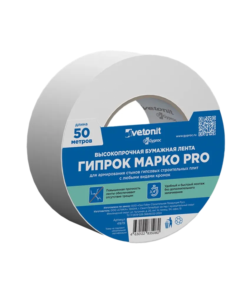Лента армирующая Марко Pro – высокопрочная бумажная лента для армирования стыков гипсовых строительных листов с любыми видами кромок. Длина – 50 м. Предотвращает трещины на стыках гипсовых плит за счет увеличенной прочности на разрыв. Изготовлена из специальной бумаги высокой плотности с распределенным, разнонаправленным целлюлозным волокном.