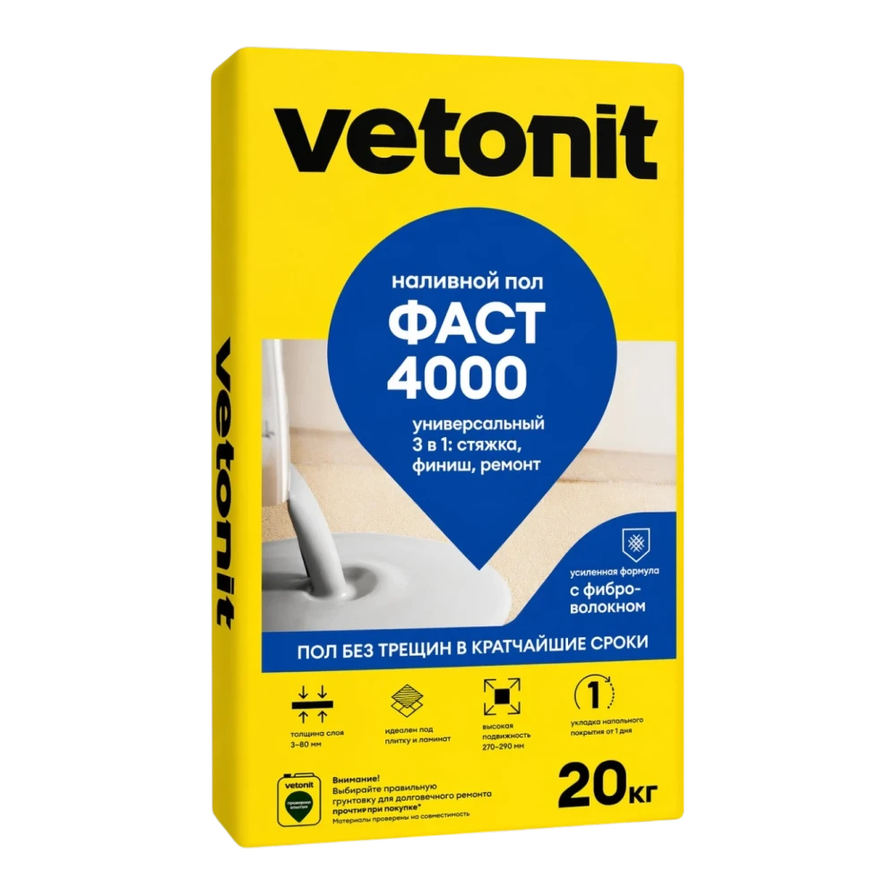 Vetonit Fast 4000 - универсальный самовыравнивающийся быстротвердеющий наливной пол. Решение «3 в 1»: подходит для устройства стяжки, финишного выравнивания и ремонта благодаря широкому диапазону толщин (3–80 мм). Используется в сухих и влажных помещениях под укладку ламината, плитки, линолеума, ковролина и других покрытий. Совместим с системами электрического «тёплого пола». В зависимости от толщины слоя и типа покрытия укладка возможна уже от 1 дня, а передвигаться по поверхности можно через 4 часа. Обладает оптимальным расходом, высокой растекаемостью и удобен в работе.
