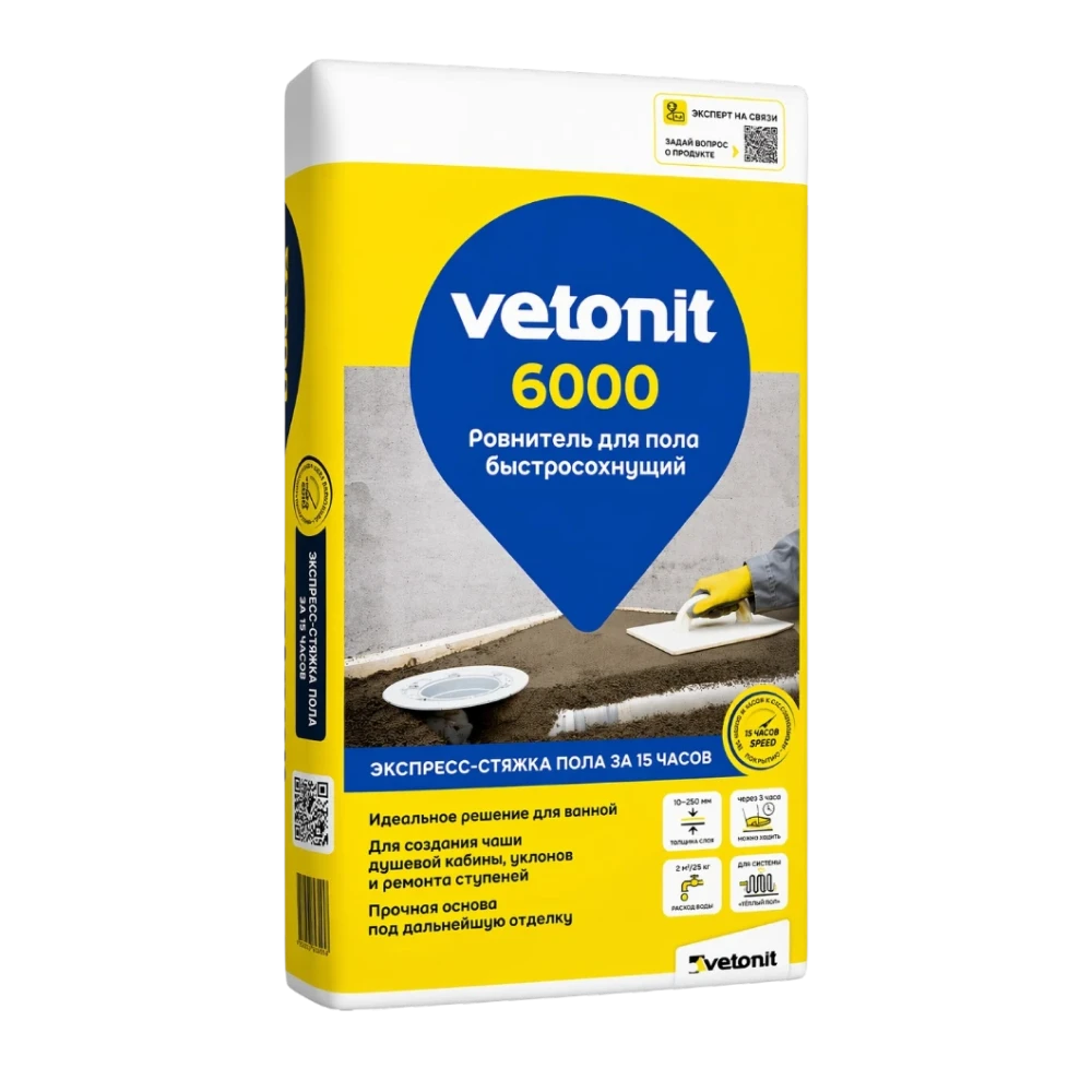 Weber Vetonit 6000 — быстросохнущий цементный ровнитель для пола, идеально подходящий для срочного ремонта. Уже через 3 часа по поверхности можно ходить, а укладка покрытия возможна через 15 часов. Отлично подходит для решения нестандартных задач: создания подиумов под ванну, формирования душевых поддонов, ремонта ступеней, скрытия коммуникаций, заделки труб и проводки. Не рекомендуется применять с бетонконтактом.
