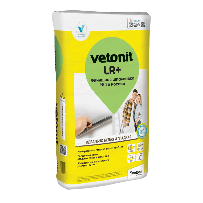 Vetonit LR+ — полимерная финишная шпаклёвка, предназначенная для выравнивания поверхностей в сухих помещениях перед оклейкой обоями, покраской, отделкой декоративной штукатуркой.