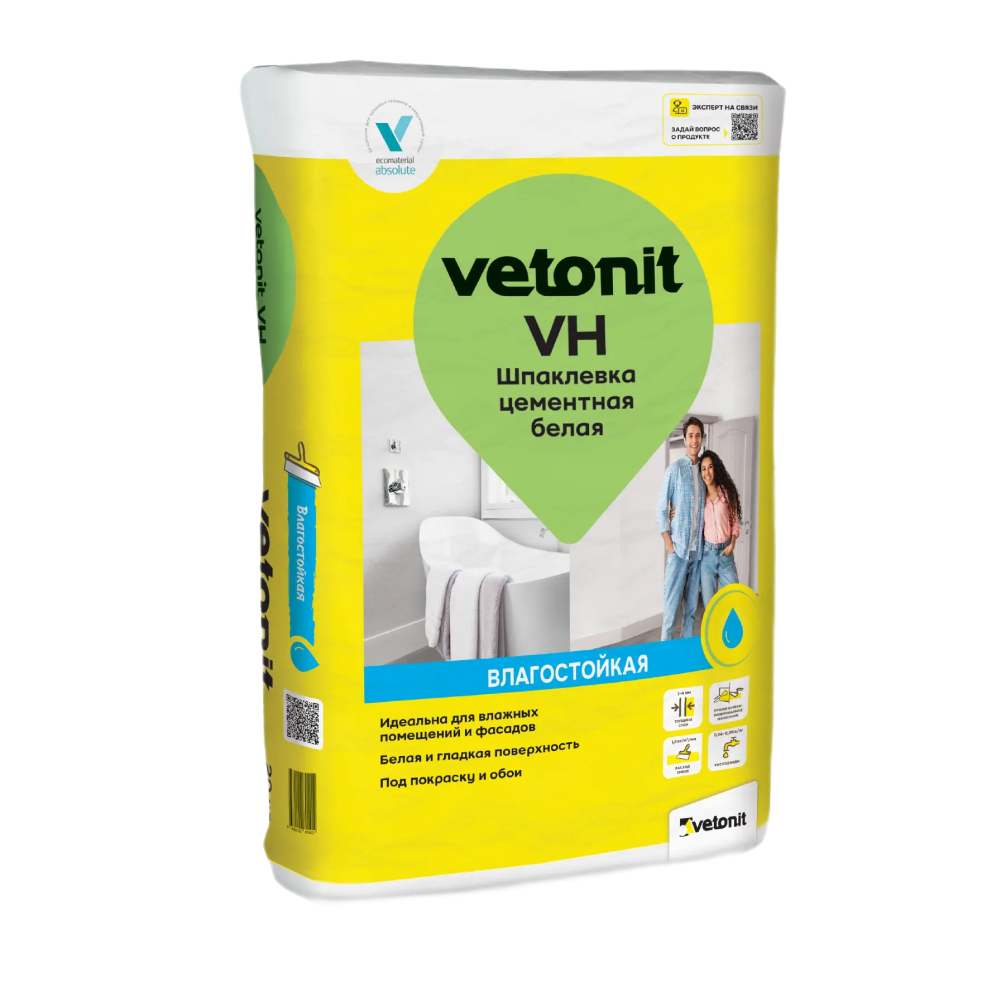Шпаклевка финишная влагостойкая цементная Vetonit VH белая, 20 кг предназначена для финишного выравнивания стен и потолков перед оклейкой обоями или покраской.