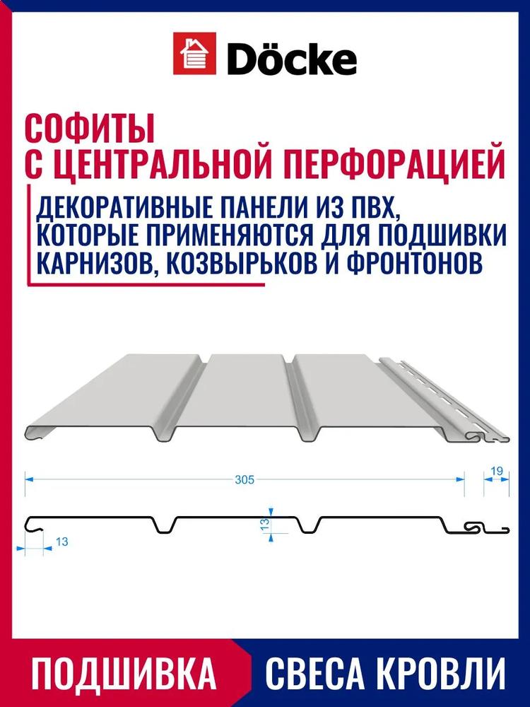 Пластиковые софиты для подшивки кровли — это универсальное решение для отделки и вентиляции крыши. Панели выполнены из премиального материала, который отличается долговечностью, устойчивостью к выгоранию на солнце и механическим повреждениям. Легкость эксплуатации позволяет быстро и удобно монтировать комплектующие на обрешетку или фаску.