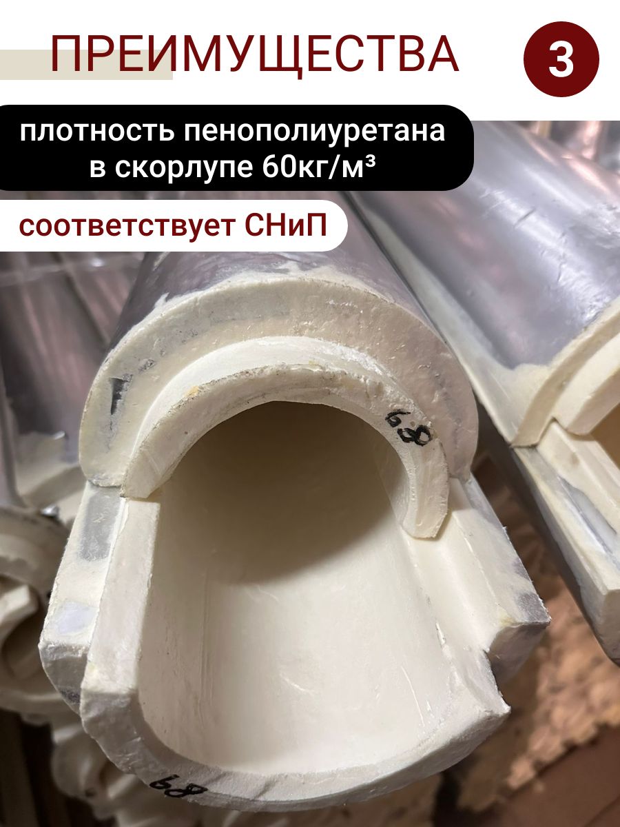 Скорлупа ППУ для труб с фольгированным покрытием (также называемая фольгированный утеплитель для труб) — это современное решение «два в одном», сочетающее преимущества жесткой пенополиуретановой основы и отражающего металлизированного слоя. Плотность пенополиуретана в скорлупе 60 кг/м³ (соответствует СНиП) и обеспечивает срок службы 25 лет. Эта теплоизоляция для труб надежно сокращает теплопотери и предотвращает образование конденсата. Утеплитель рассчитан для труб с внешним диаметром 57 мм.