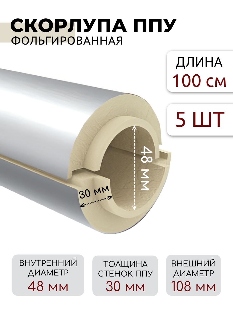 Купить Утеплитель для труб, фольгированный, скорлупа ППУ, для трубы с внешним диаметром 48мм., 5 шт по 1 м. по выгодной цене в ДомИнком