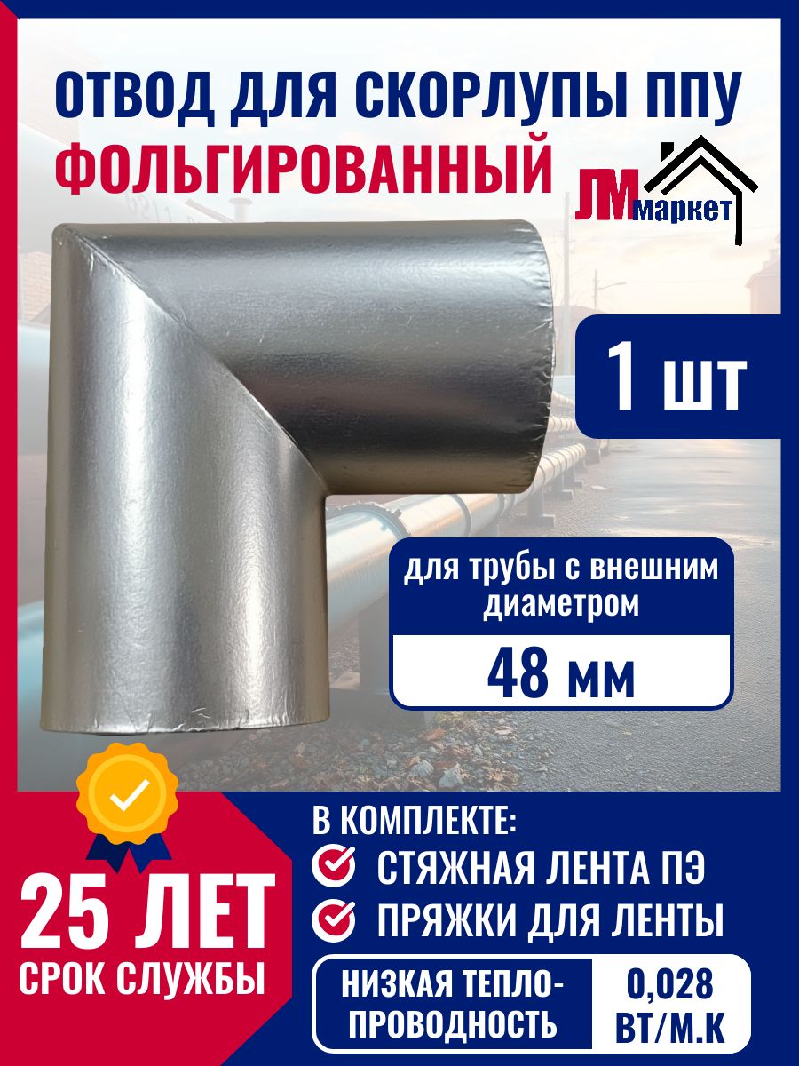 Купить Утеплитель для труб, фольгированный, скорлупа ППУ, отвод 90 гр. для трубы с внешним диаметром 48 мм. по выгодной цене в ДомИнком