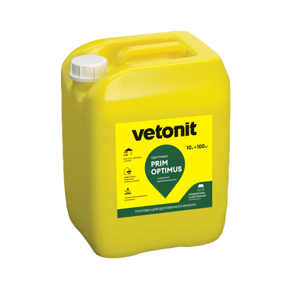 Vetonit prim optimus – грунтовка глубокого проникновения для качественной подготовки стен, потолков и полов под последующее оштукатуривание, шпаклевание, окрашивание, оклейку обоями, приклеивание плитки, нанесение полимерной гидроизоляции, ровнителей и наливных полов.