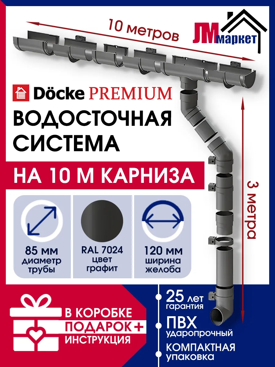 Купить Водосточная система, Docke Premium, 10м/3м, RAL 7024, цвет графит, водосток на крышу дома пластиковый по выгодной цене в ДомИнком
