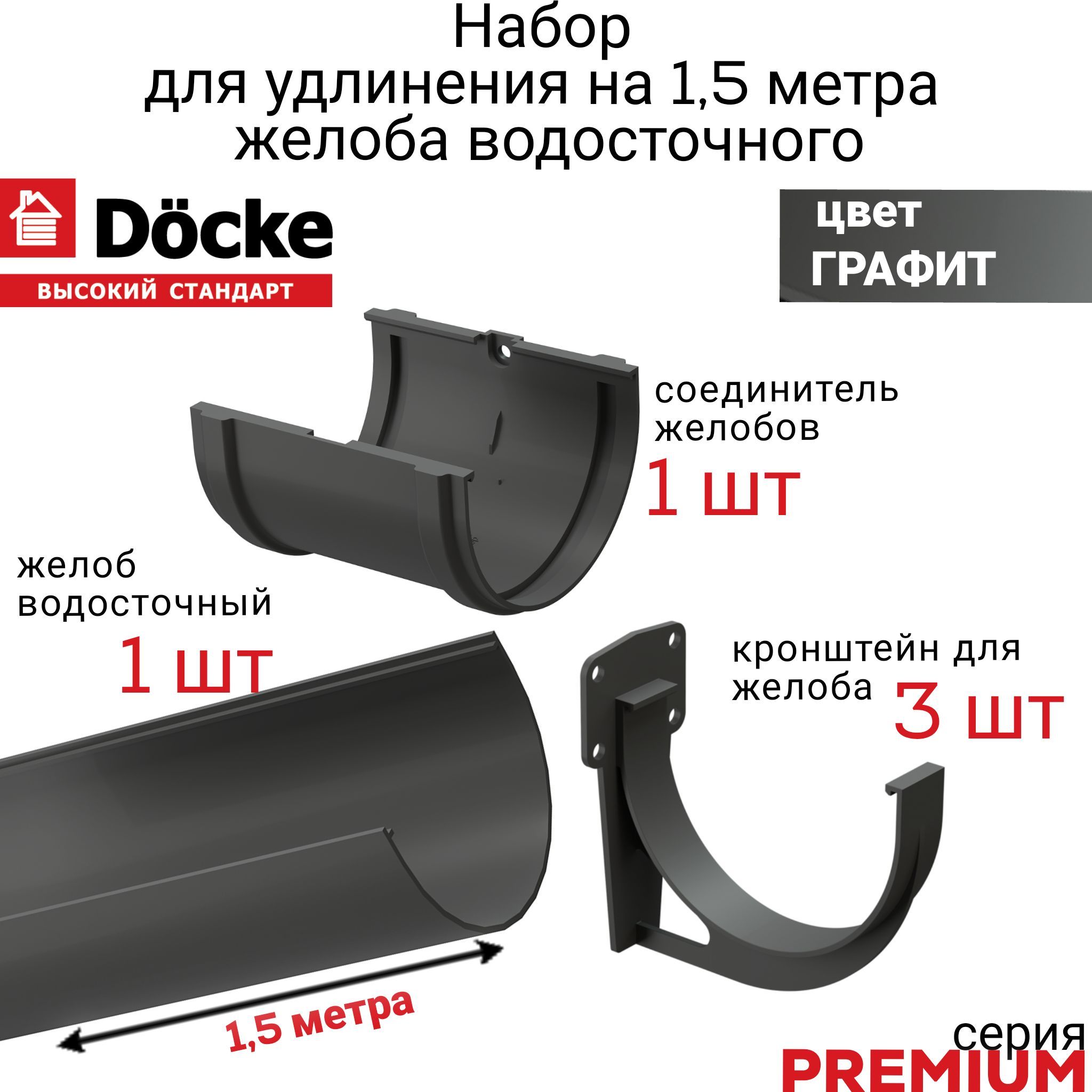 Купить Водосточный желоб с держателем 1,5 м Docke Premium, цвет графит, желоб 1,5 м х 1 шт, кронштейн - 3 шт. соединитель - 1 шт по выгодной цене в ДомИнком