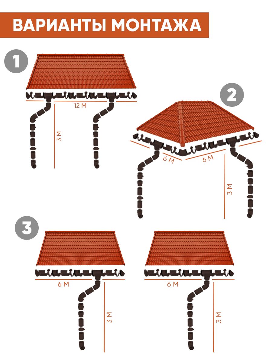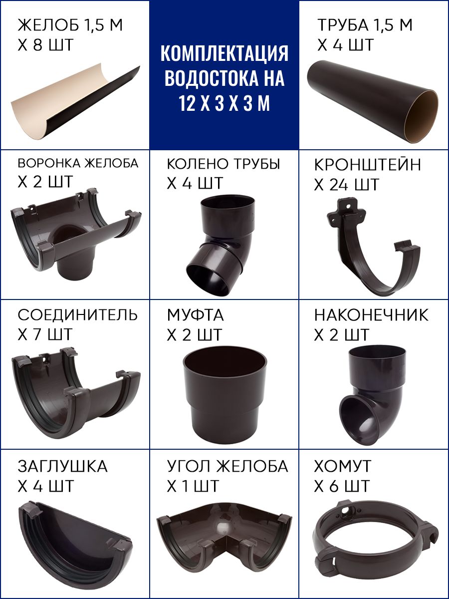 Набор водосточной системы на длину карниза до 12 метров, высоту 3 метра х 3 метра состоит из: