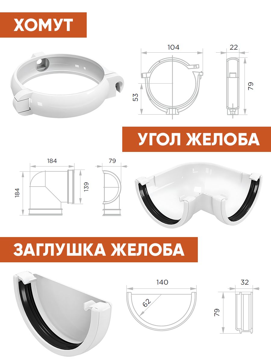 - Готовый комплект водосточной системы включает все необходимые элементы для монтажа системы водоотвода без дополнительных покупок.