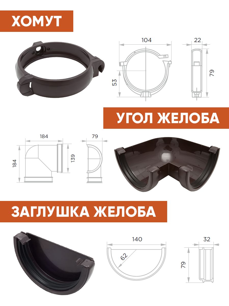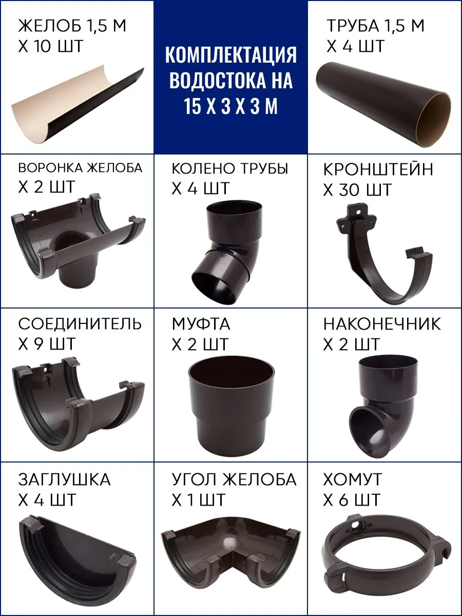 Набор водосточной системы на длину карниза до 15 метров, высоту 3 метра х 3 метра состоит из: