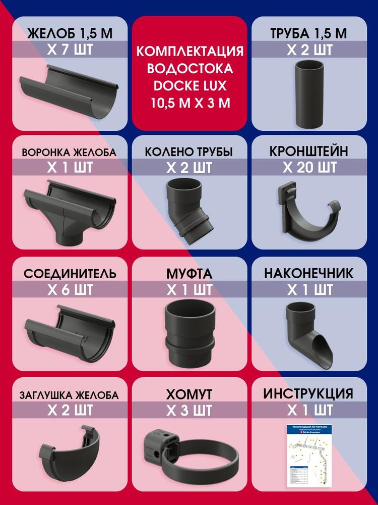 Купить Водосток для крыши дома Docke LUX 10,5м/3м, графит, RAL 7024, комплект водостока по выгодной цене в ДомИнком