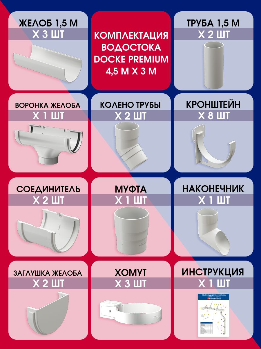 Купить Водосток для крыши дома Docke Premium, 4,5м/3м, RAL 9003, цвет пломбир по выгодной цене в ДомИнком