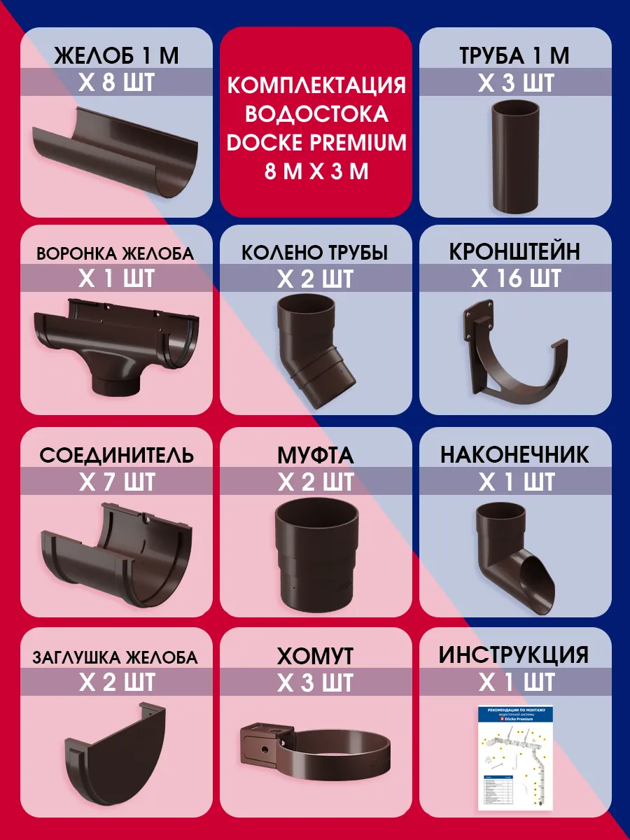 Купить Водосток для крыши дома, Docke Premium, 8м/3м, RAL 8019, цвет шоколад, водосточная система, комплект по выгодной цене в ДомИнком