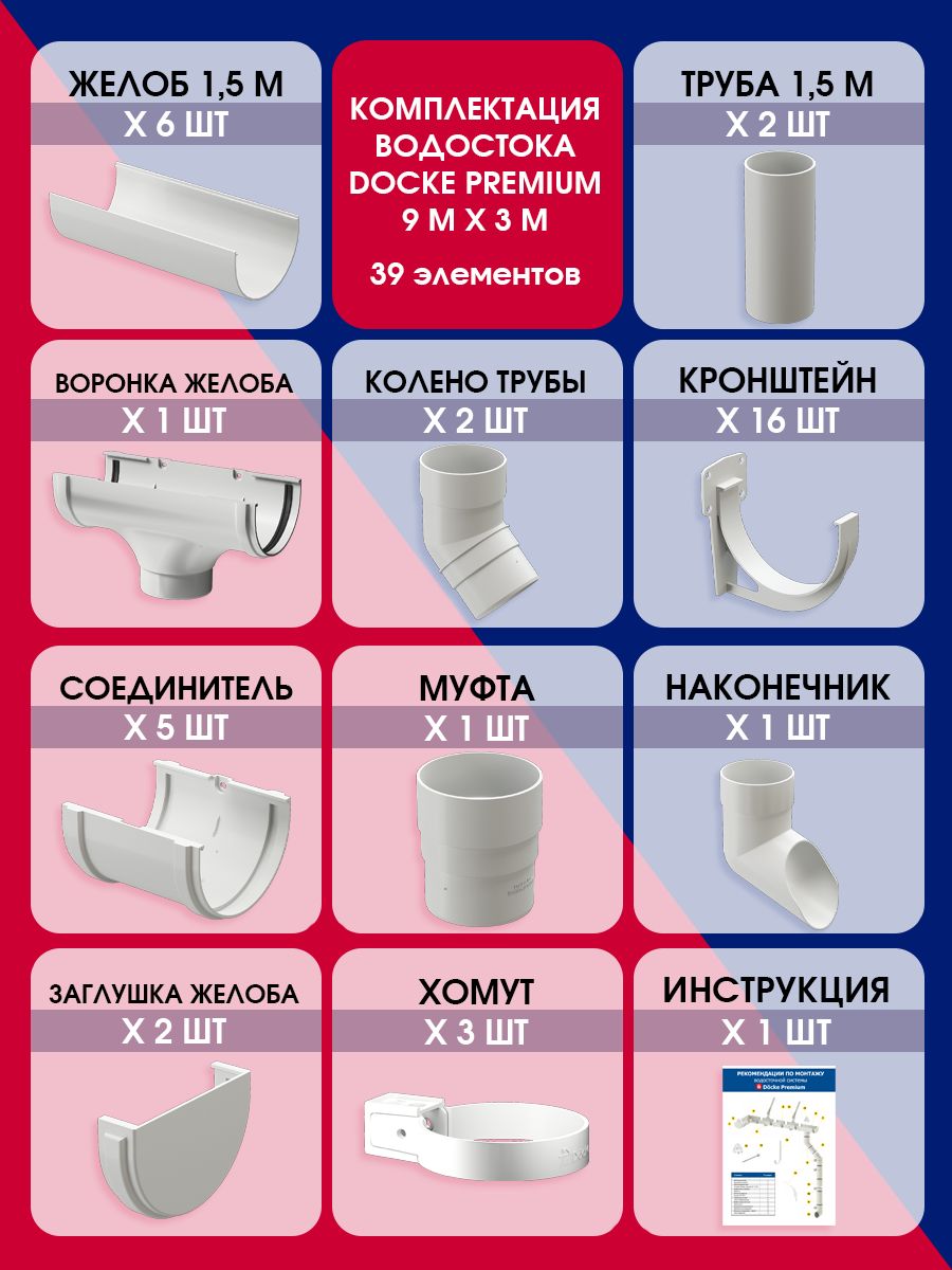 Комплект водосточной системы включает всё необходимое для монтажа системы длиной до 9 метров: желоба, трубы, кронштейны и соединители. Простота сборки позволяет быстро организовать водоотвод даже при сложной конфигурации крыши.