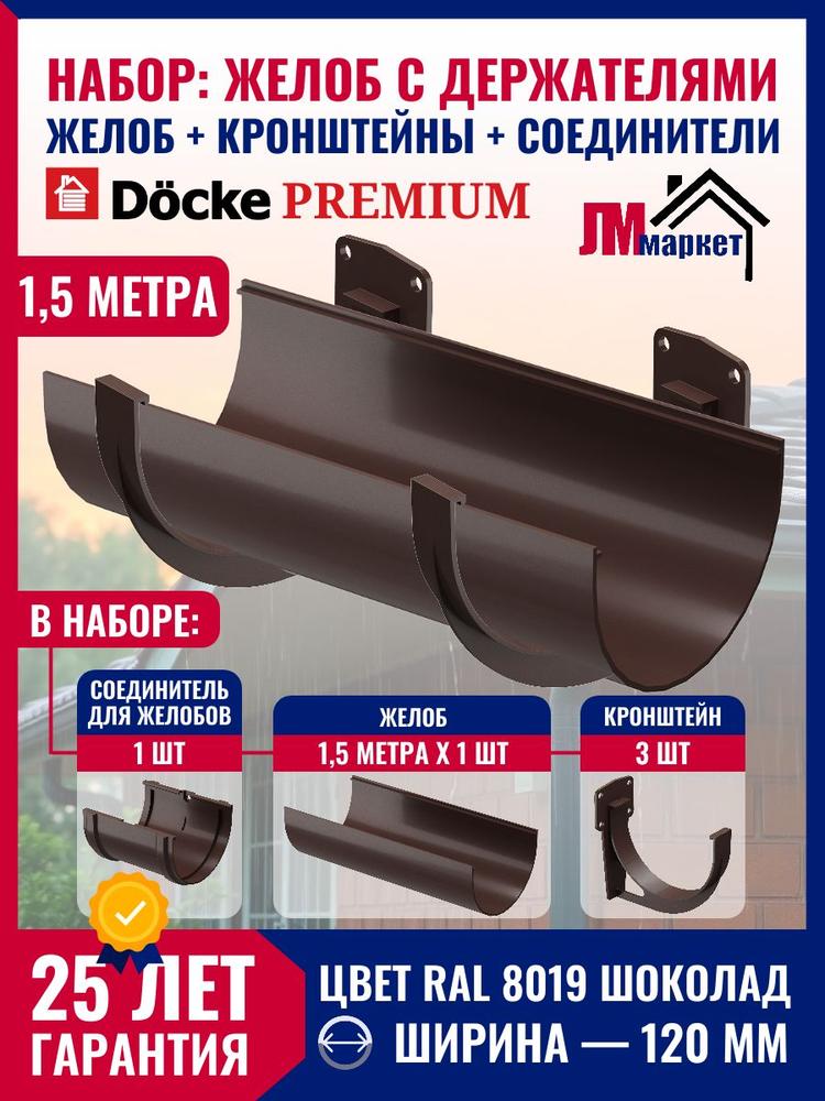 Купить Желоб водосточный с держателями 1,5м Docke PREMIUM, цвет шоколад, желоб 1,5 м х 1 шт, кронштейн - 3 шт, соединитель - 1 шт по выгодной цене в ДомИнком